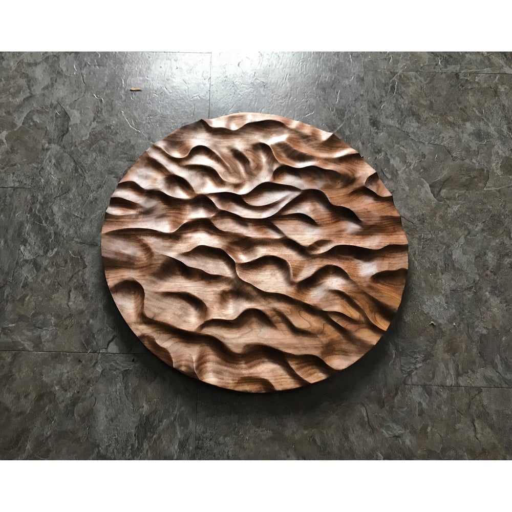 19 inch round. Carved by hand. Second in a series of carvings meant to explore the way water ripples on its surface. Finished with beeswax/ mineral oil combo.
