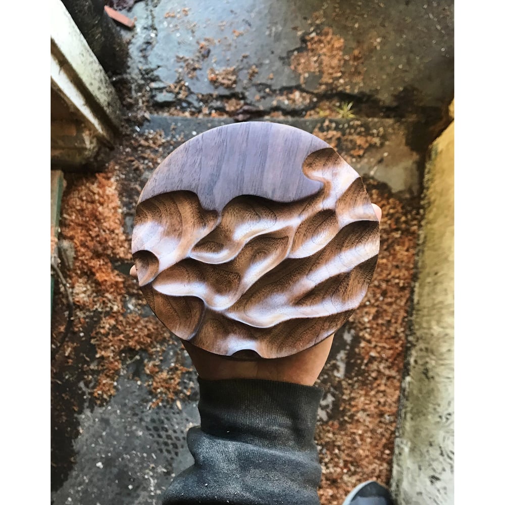 Hand carved. Walnut. 6 inch round. This was an experimental carving I did in hopes of exploring a new theme in my work: The way water shapes rocks on a shoreline. Finished with beeswax/ mineral oil. This pierce can either be hung on a wall, displayed on a shelf or laid flat on a table as a conversation piece.