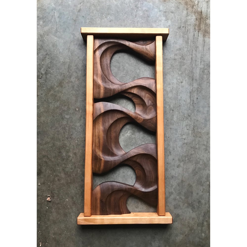 21x8 inches, 1.5 inches thick. Walnut carving with a curly maple frame. Hand carved, finished with beeswax/ mineral oil combo.